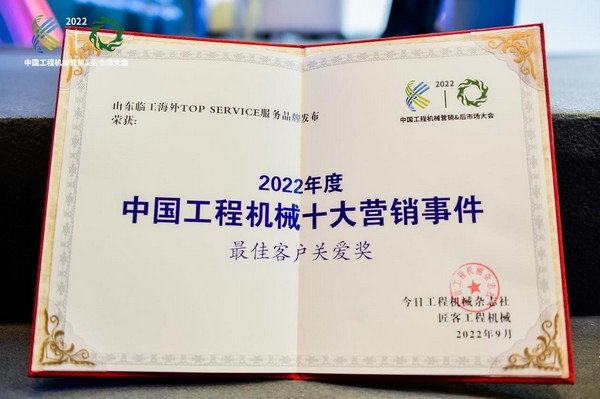 2022年9月15日,以“穿越周期”为主题的中国工程机械营销&后市场大会在江苏昆山盛大举行。山东临工凭借多年来以客户为中心的营销策略,以“山东临工TOP SERVICE服务品牌全球发布”活动荣登“2022年度中国工程机械十大营销事件”榜单,斩获“客户关爱奖”,既树立了山东临工深入人心的专业服务典范,也彰显出山东临工超凡的品牌影响力。